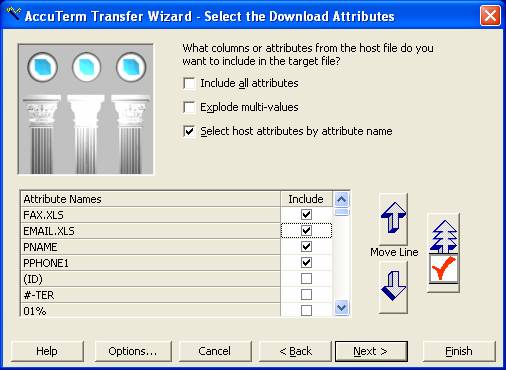 15. Check the "Select host attributes by attribute name" check box. For each Dictionary Item that you want, click the "Include" check box. Scroll down to select more dictionaries. Click the red check mark to move the selections to the top. Click the Up Arrow and Down Arrow to position the columns. Click Next.
